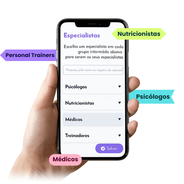 - Para empresas: Você escolhe quais módulos deseja oferecer aos seus colaboradores (nutrição, treino, saúde mental e endocrinologia). Cada colaborador terá acesso ao aplicativo personalizado da empresa, onde poderá montar sua própria equipe de especialistas: um nutricionista, um treinador, um médico e um psicólogo.